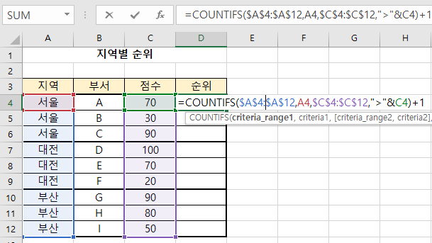 coutifs를 위와 같이 작성하고 드래그만 해주시면, 지역별 점수의 등수가 한번에 계산됩니다.